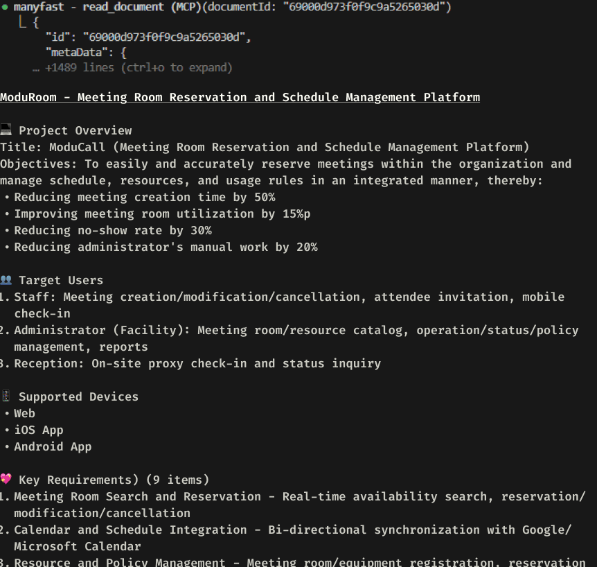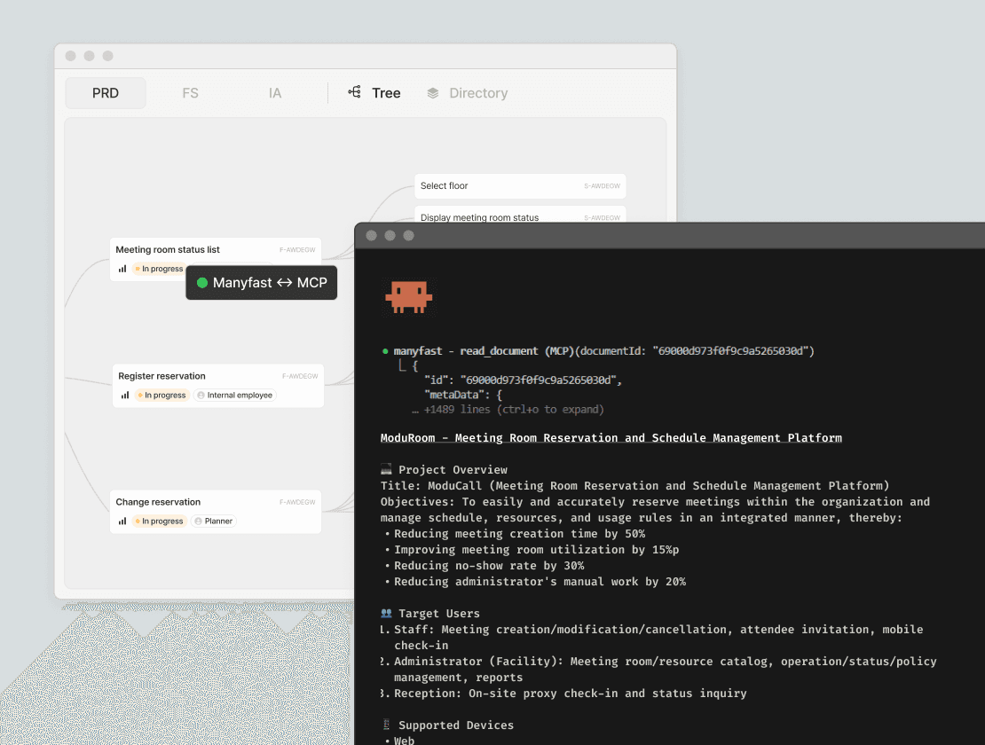 Seamlessly integrate with MCP. Feed your Manyfast docs directly as context to start AI-powered development in Cursor or Claude Code immediately.