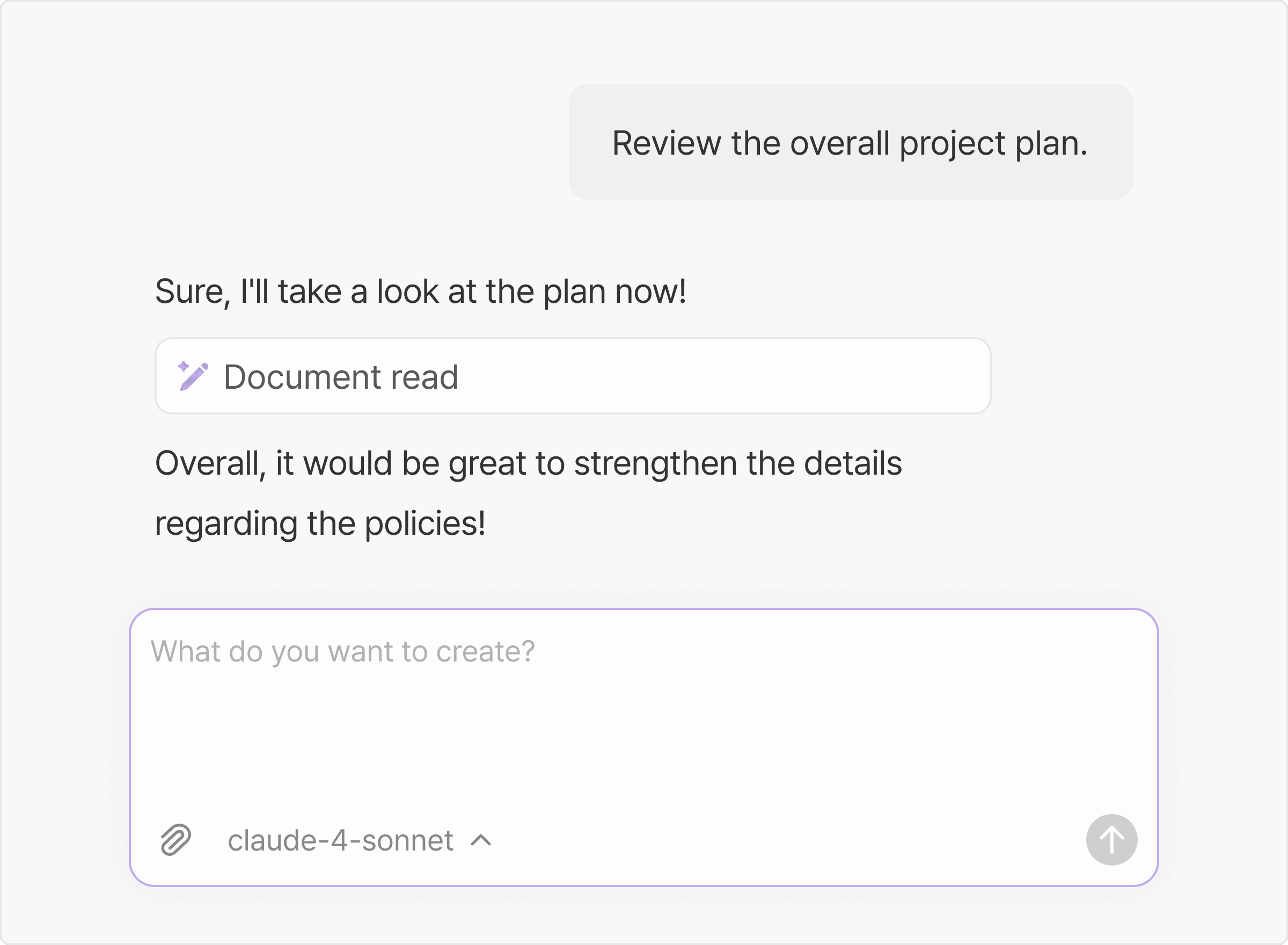Go beyond simple editing and generation. Use our AI Agent to ask questions or as a dedicated reviewer to evaluate your entire plan.