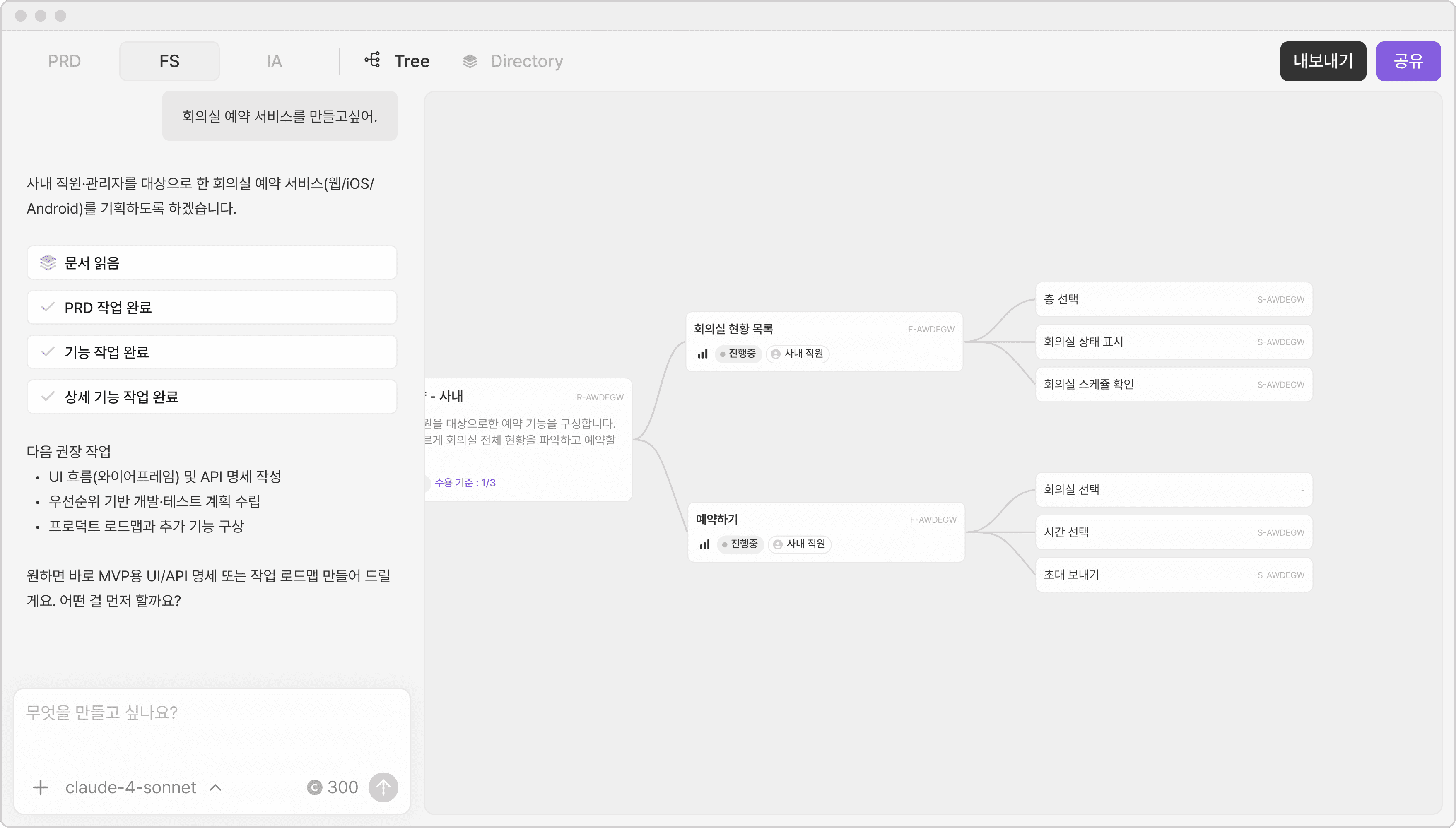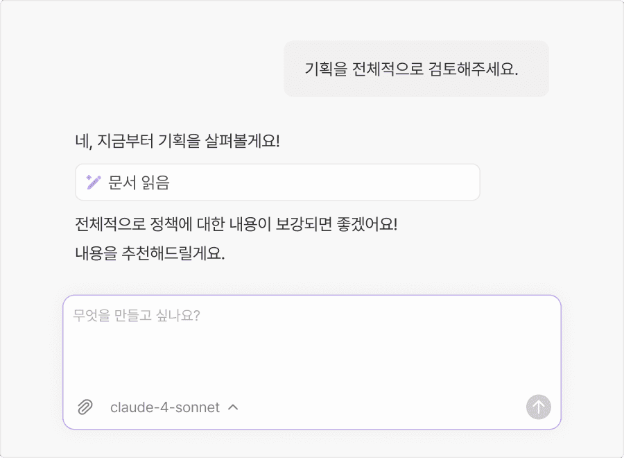 내용을 수정·생성하는 에이전트 기능에 더해 챗봇처럼 질문하거나, 전체 기획을 검토하는 리뷰어로 활용할 수 있습니다.