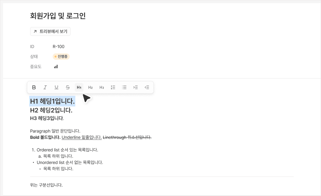 설명란 작성이 훨씬 더 자유로워졌습니다. 이제 디렉토리뷰에서 마크다운 문법을 지원하여 텍스트 굵기, 기울임, 헤딩(H1~H3), 리스트 등을 자유롭게 활용할 수 있습니다. 더 가독성 좋은 기획서를 매니패스트 안에서 직접 완성해 보세요.
