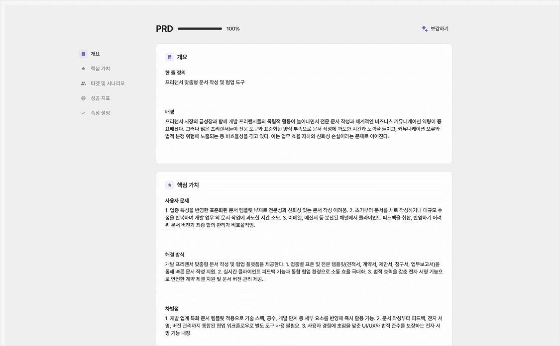 기존의 핵심 정보 위주였던 PRD가 대폭 보강되었습니다. 이제 한 줄 정의와 배경은 물론, 사용자 문제, 해결 방식, 차별점, 상세 시나리오와 핵심 KPI까지 한 번에 정리할 수 있습니다. AI와 함께 우리 서비스의 비전을 더욱 입체적으로 설계해 보세요!